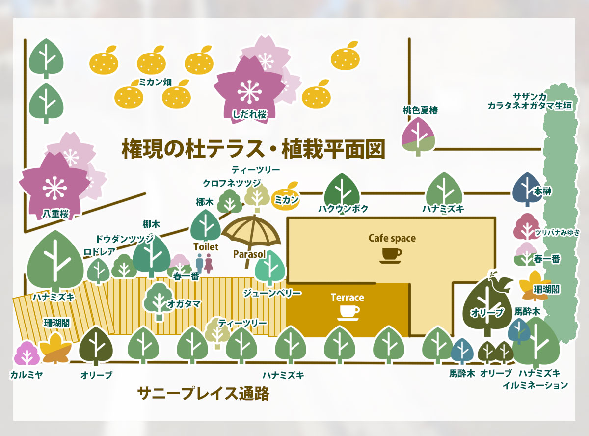 オリーブ・ハナミズキに包まれて過ごせる心休まるカフェです。